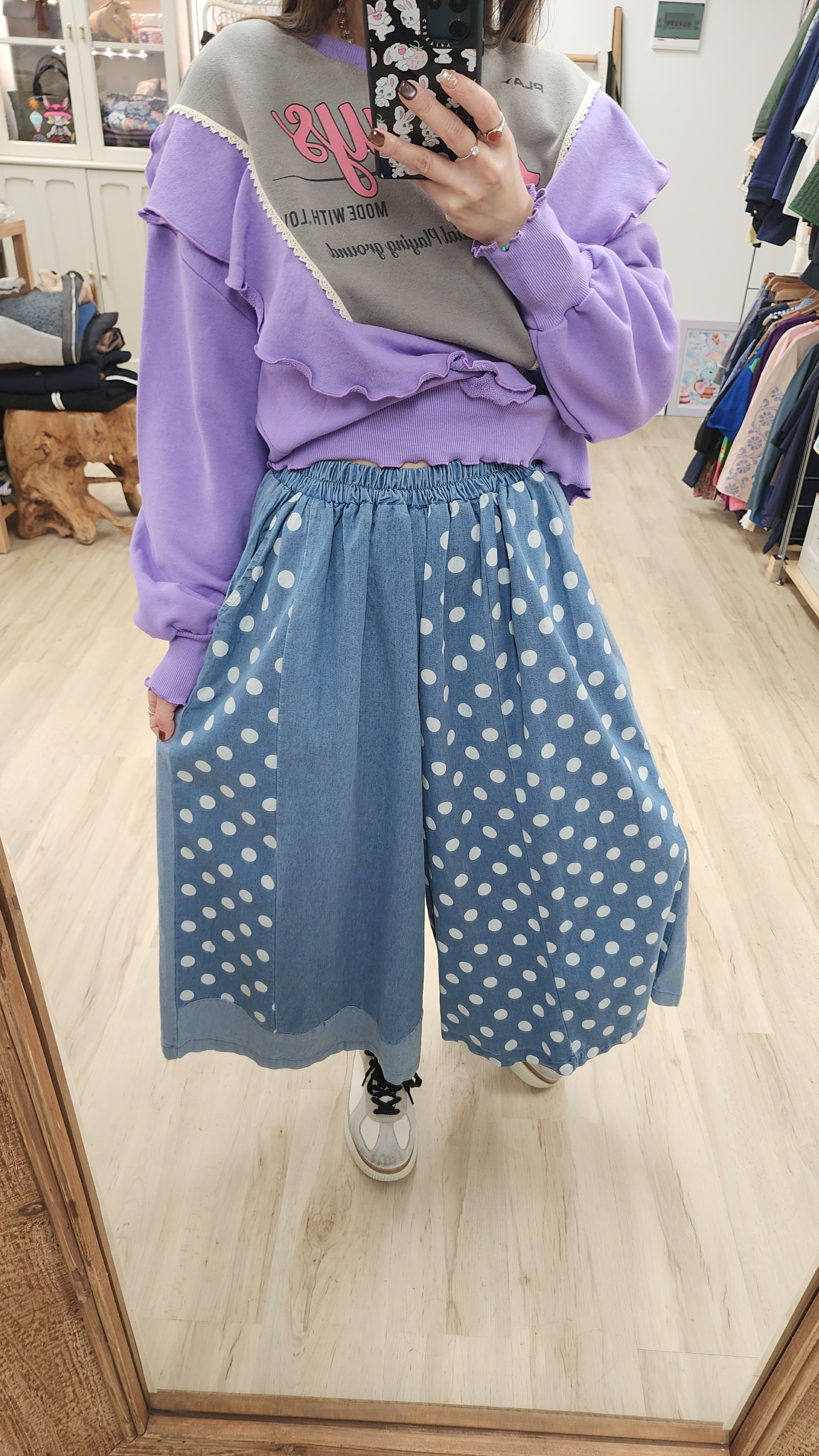 韓國淺藍拼白波點橡筋牛仔裙褲