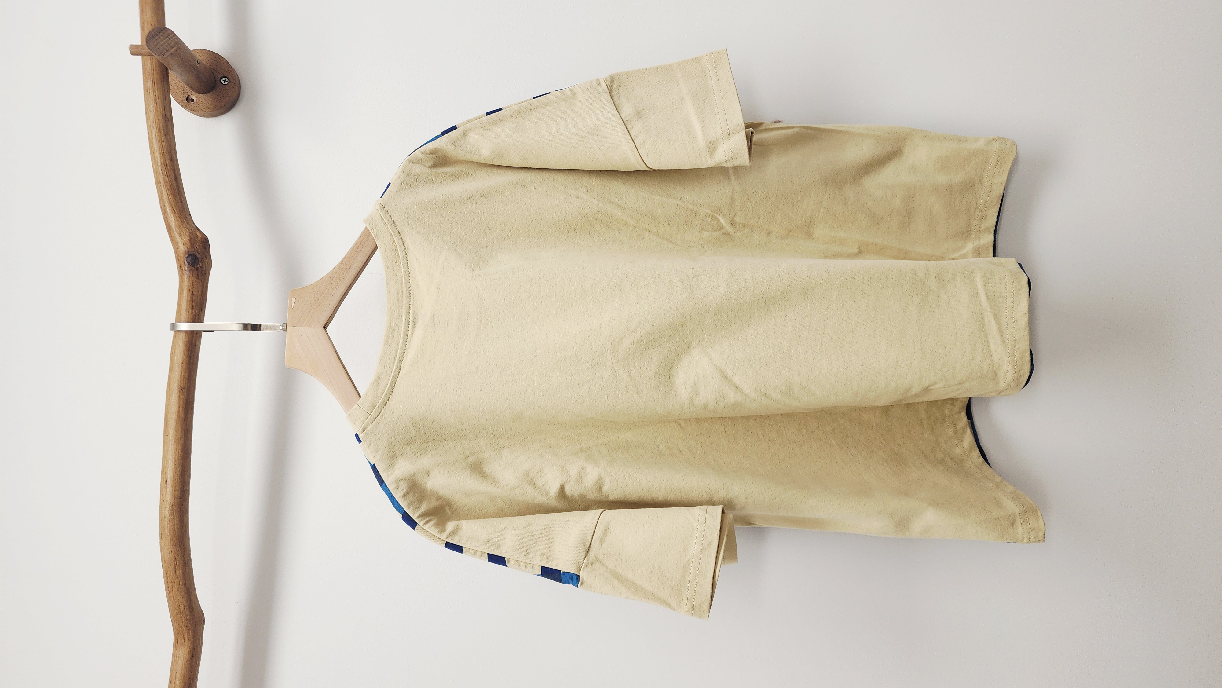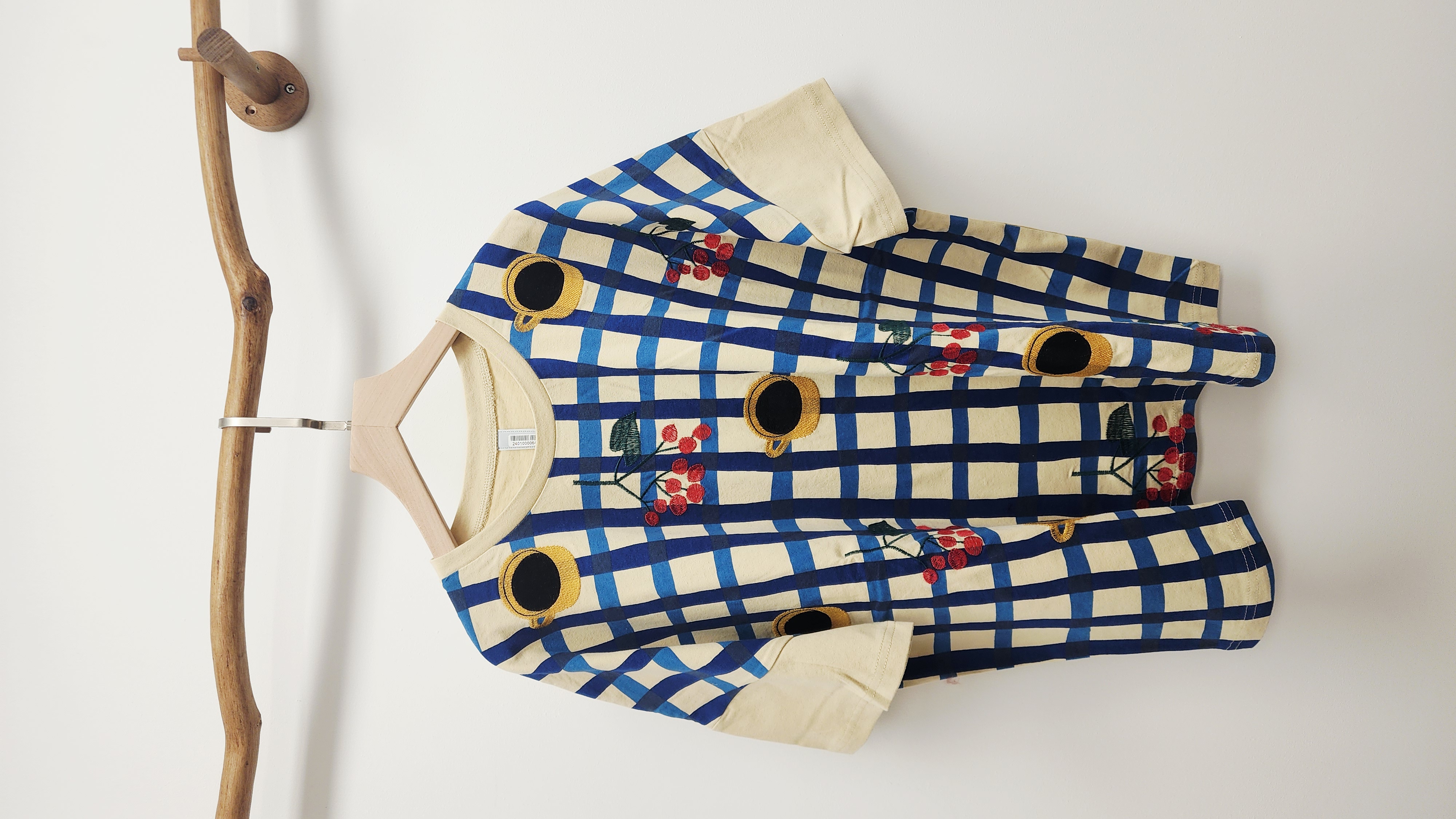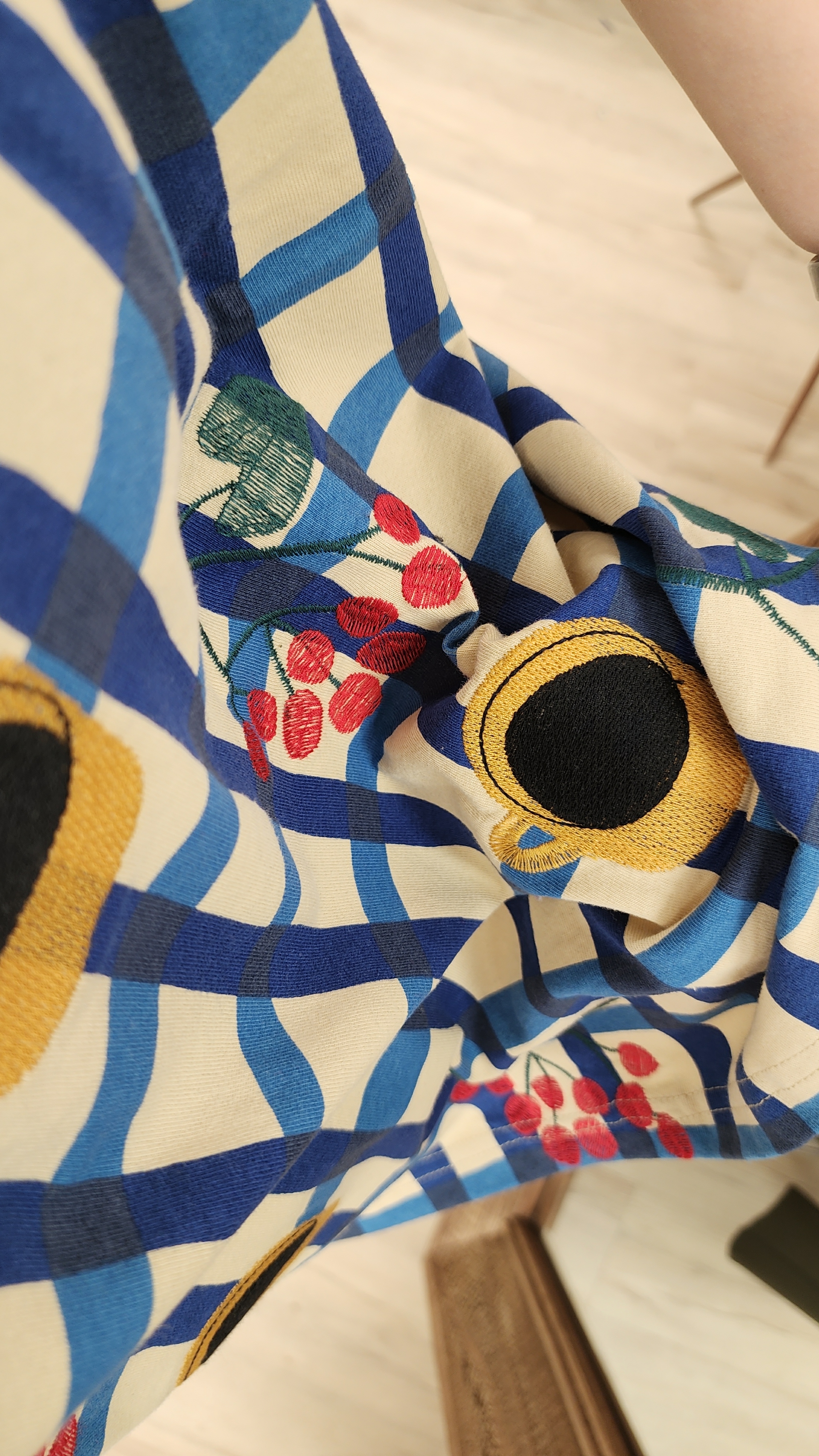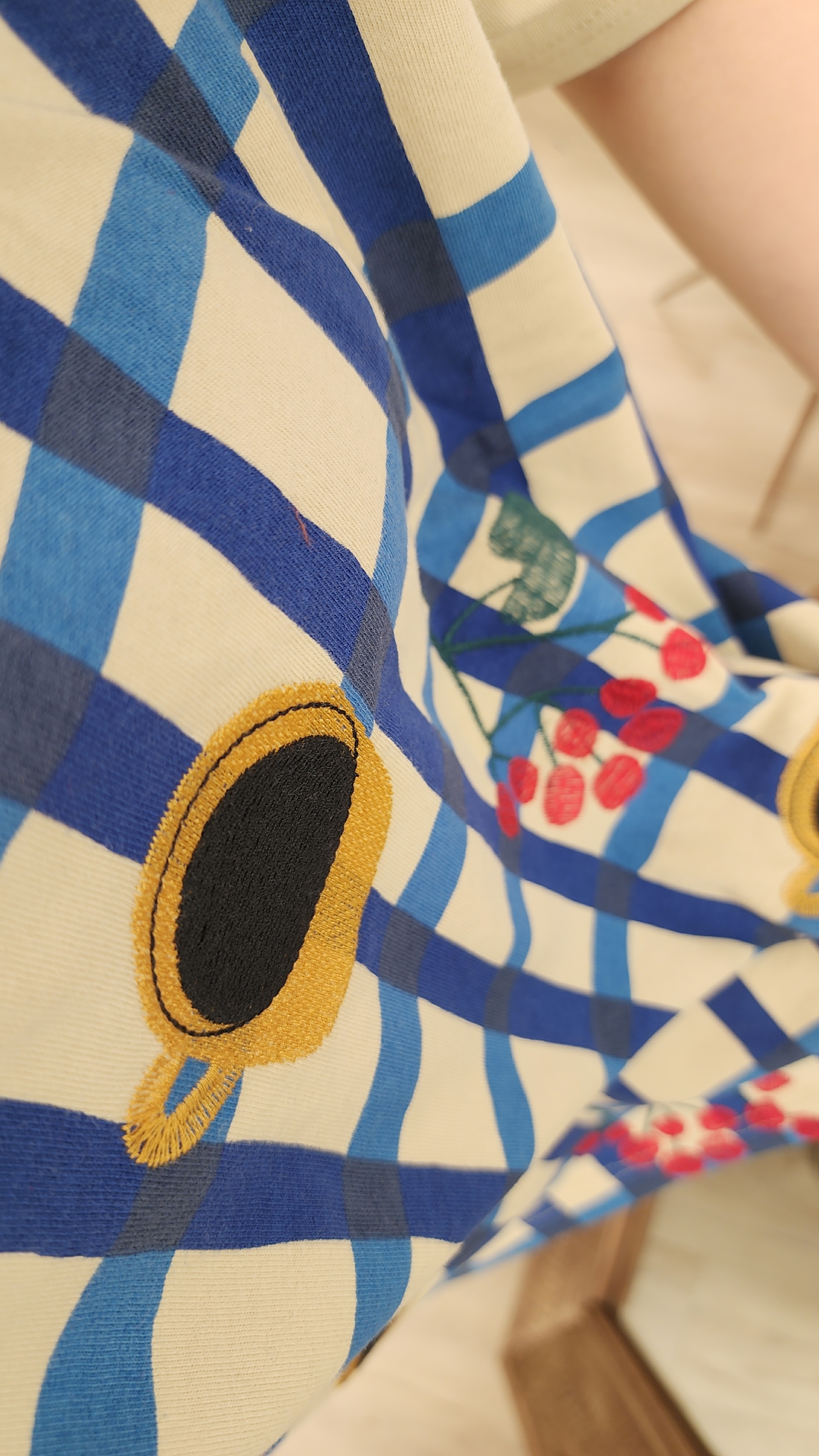 日牌杏拼藍格仔茶杯果實刺繡Tee