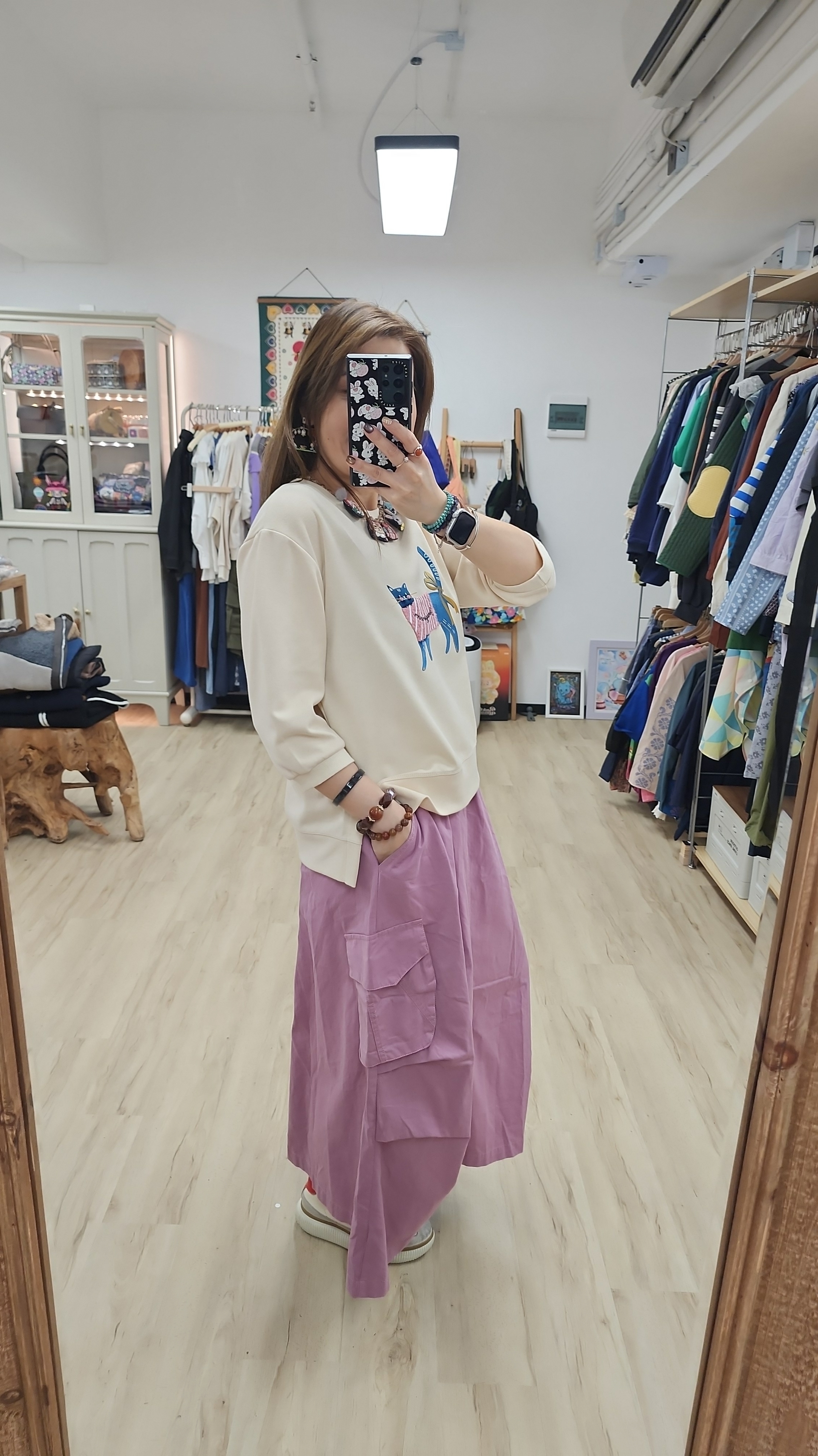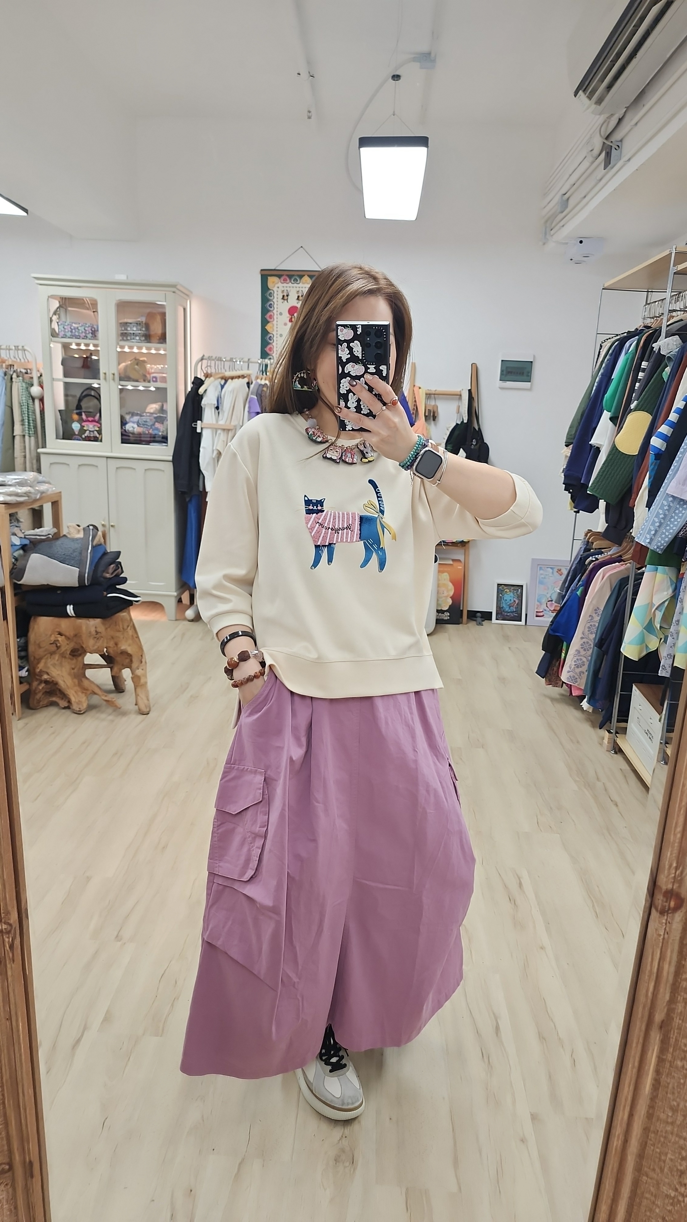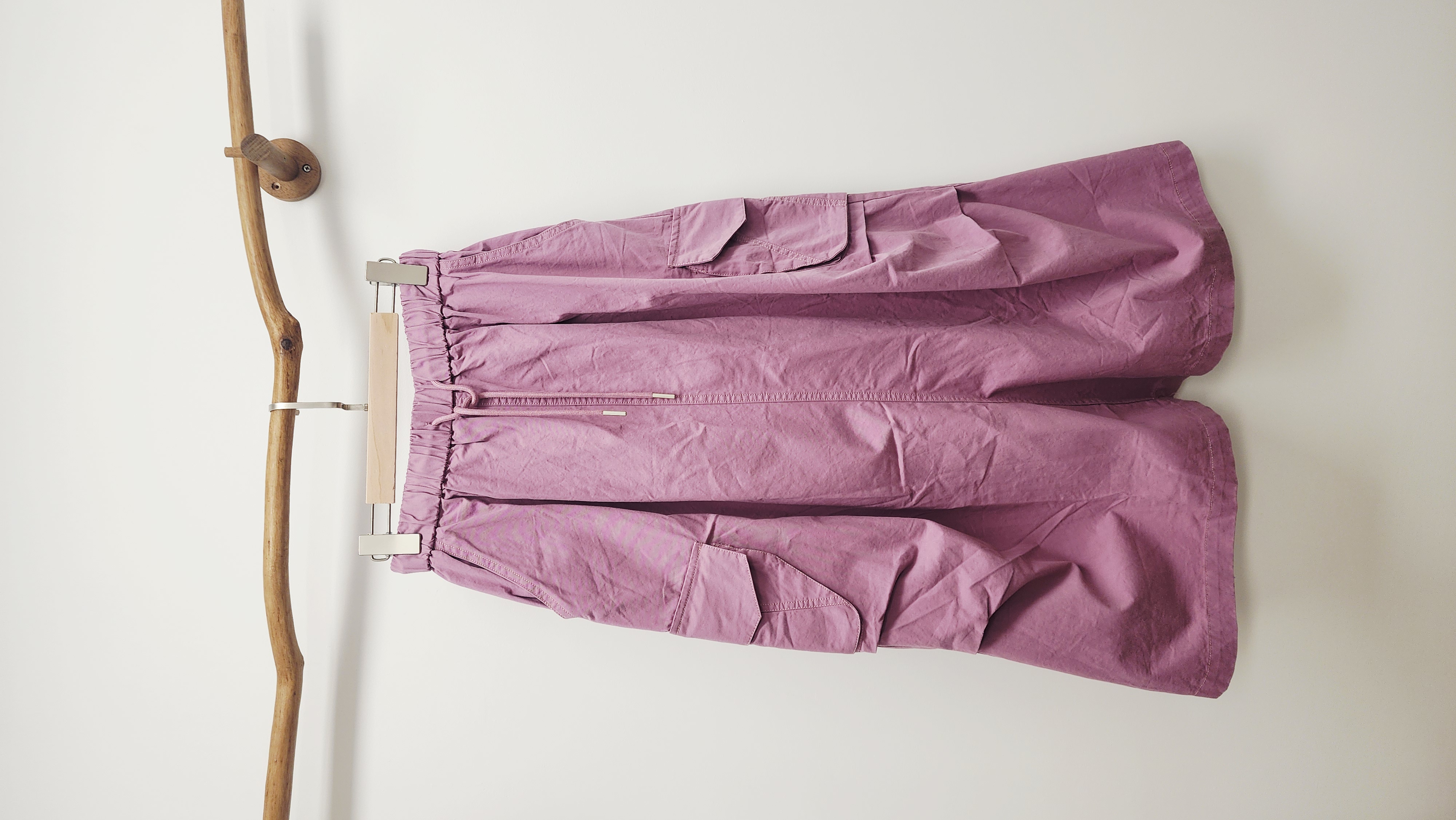 日牌紫拼兩側袋斜布橡筋裙