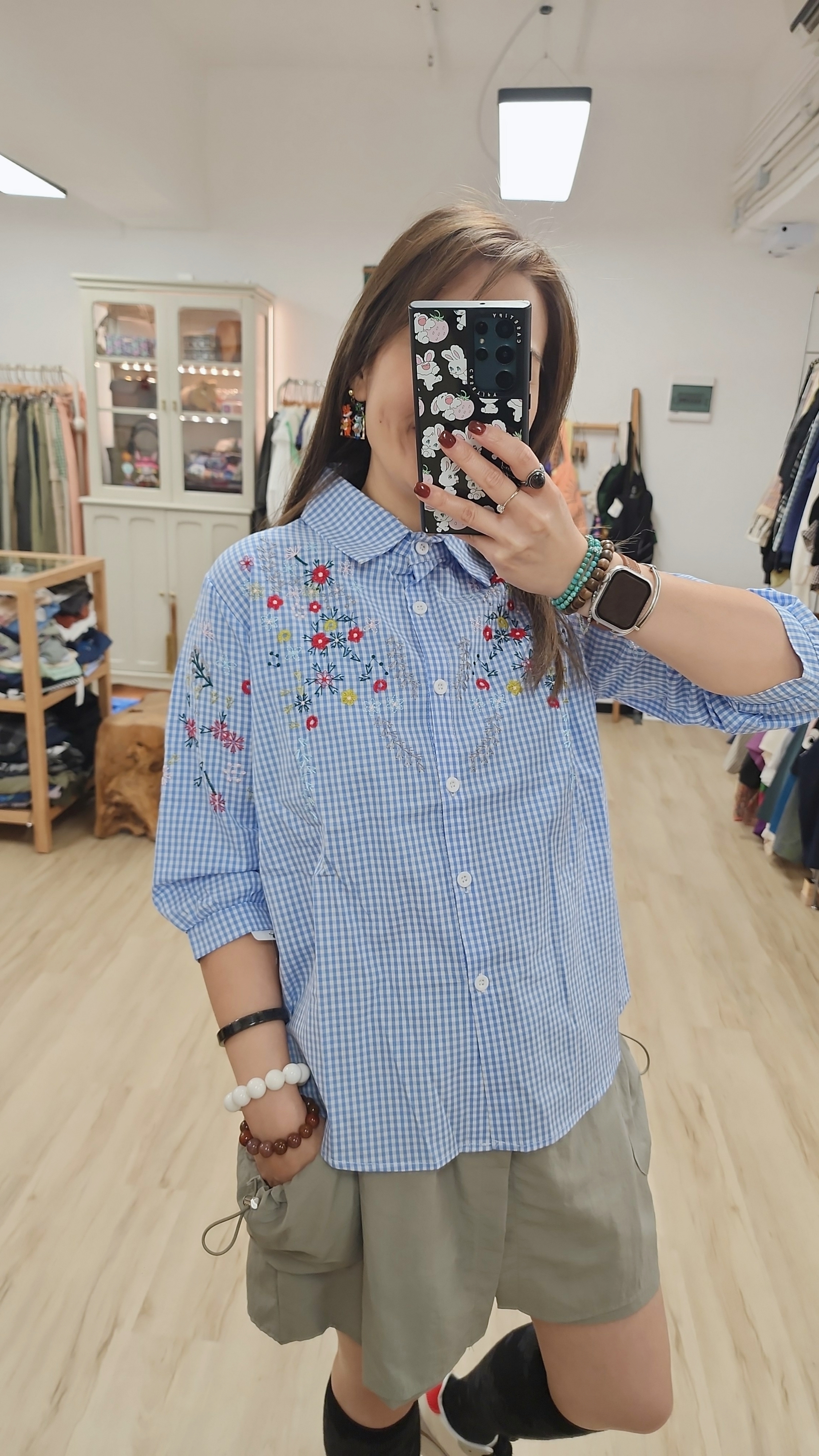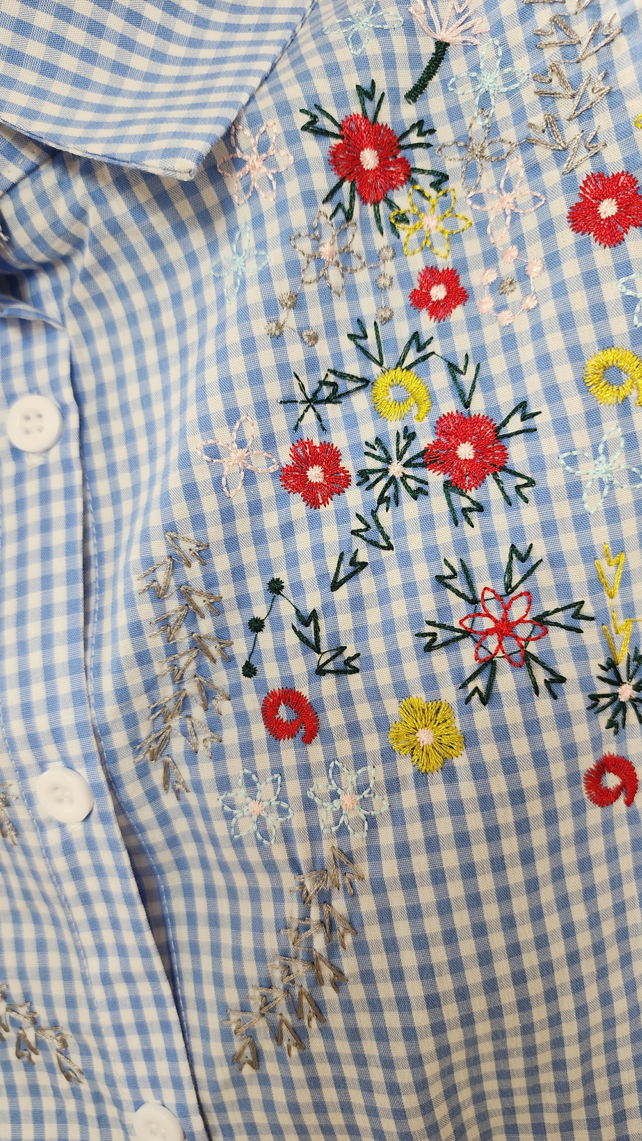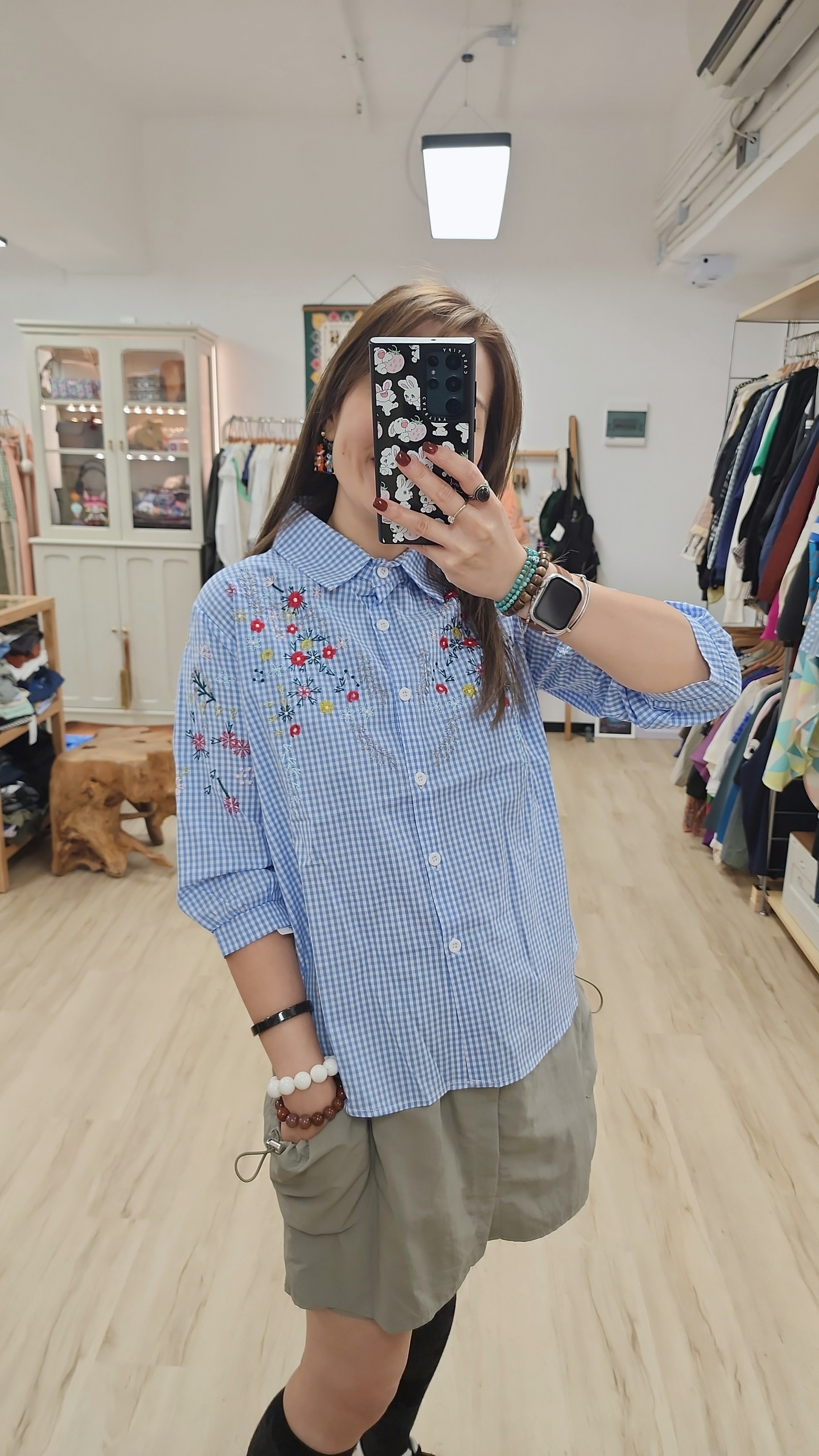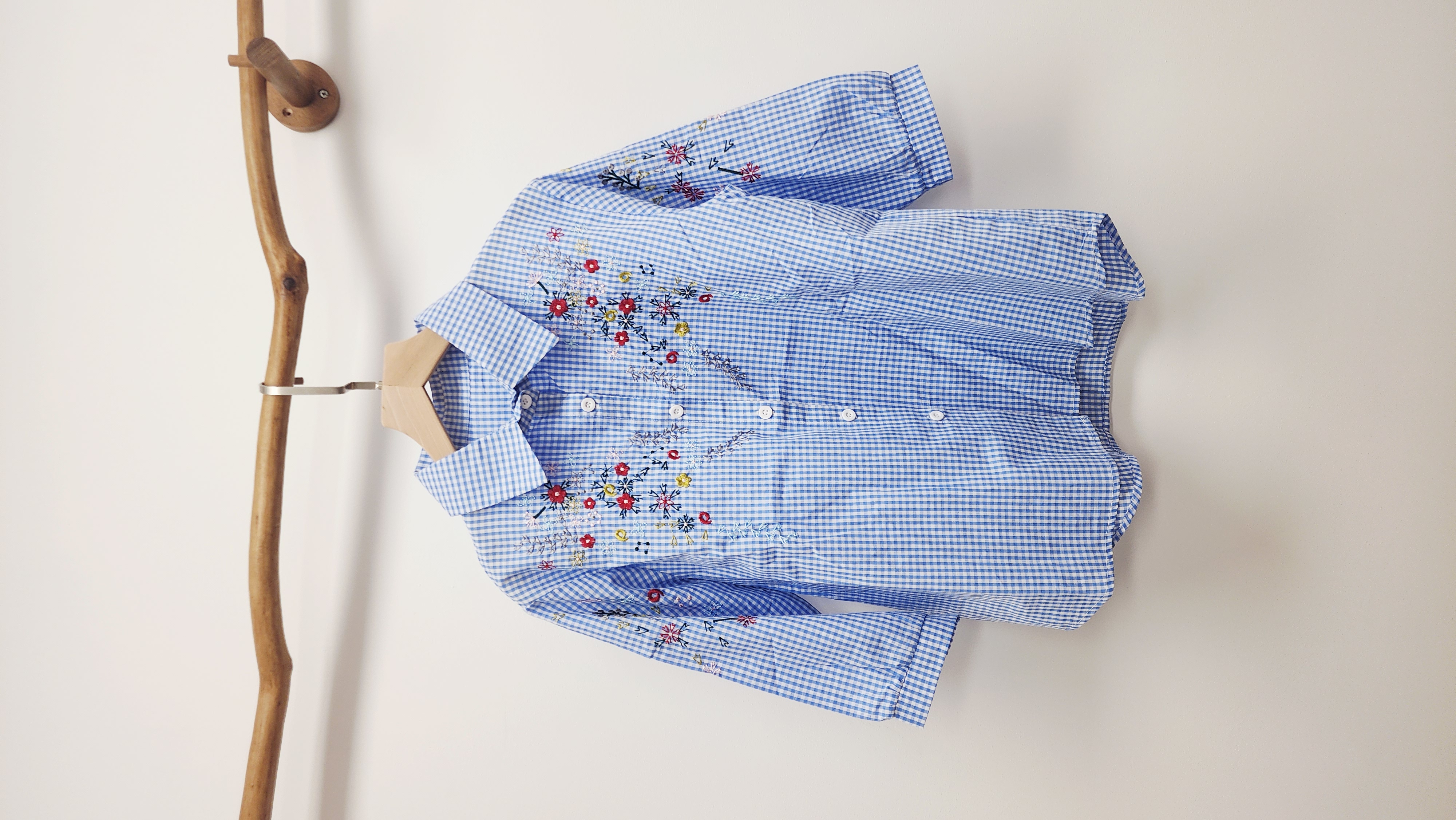 日牌藍白格仔刺繡花開胸裇
