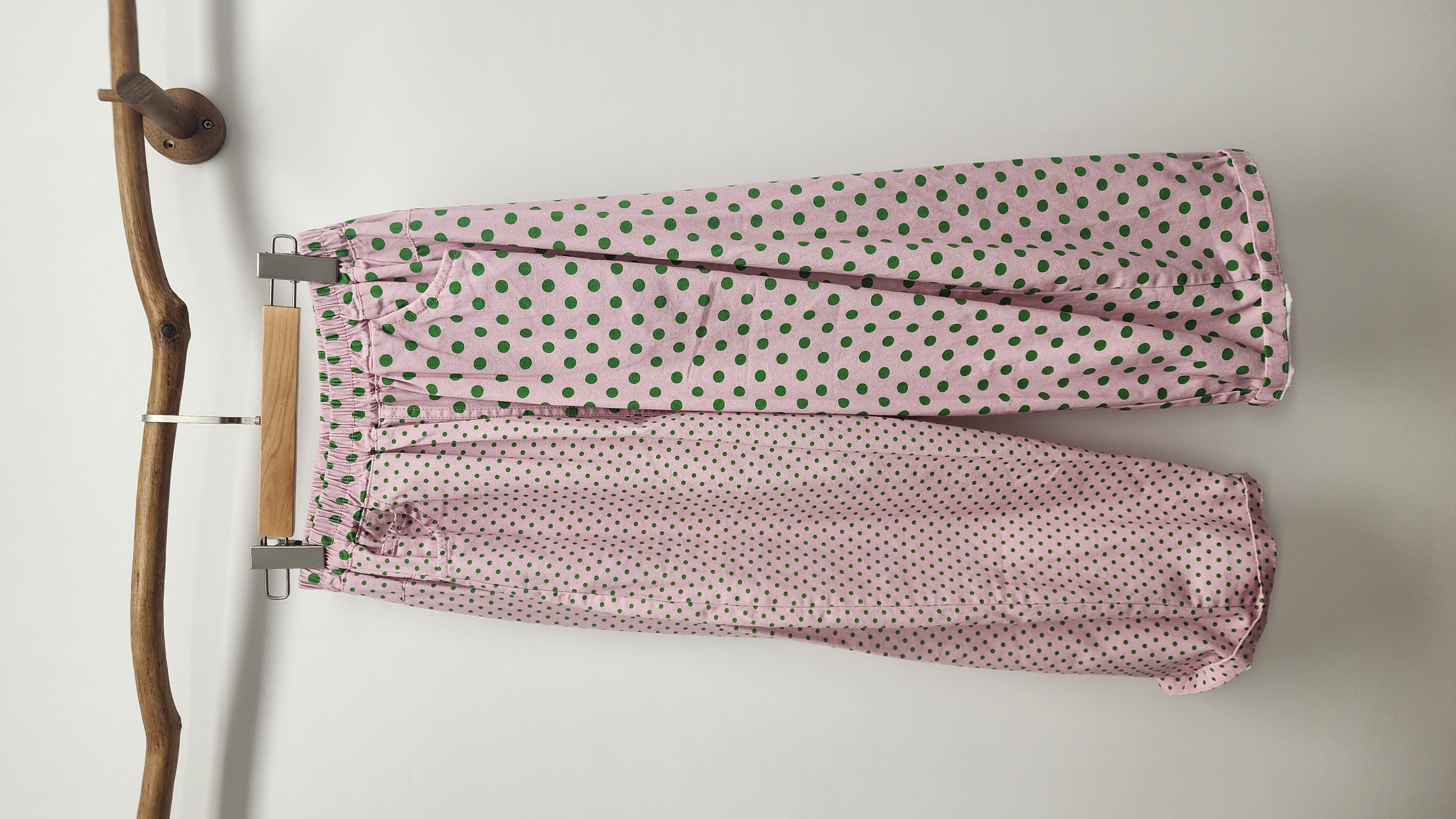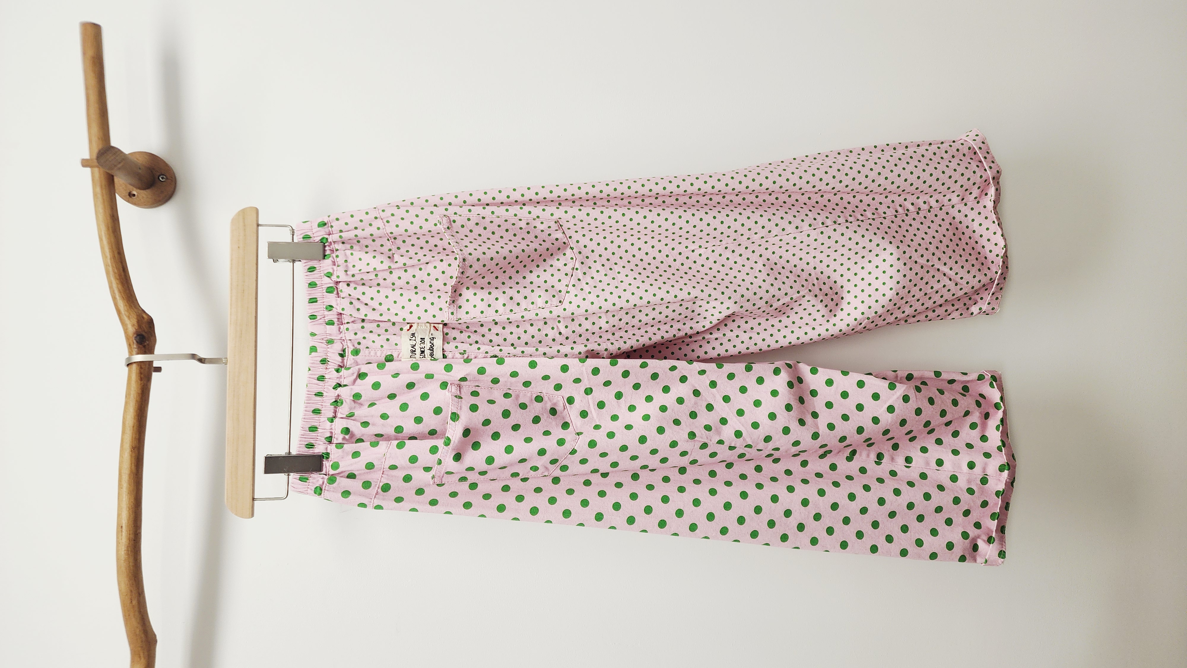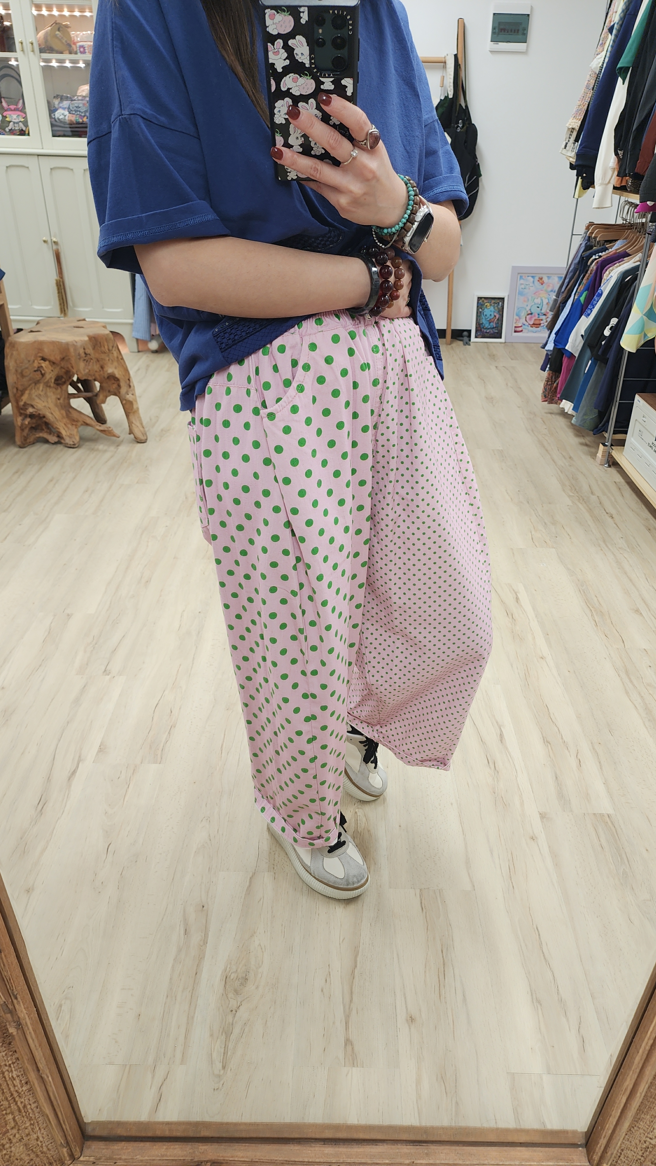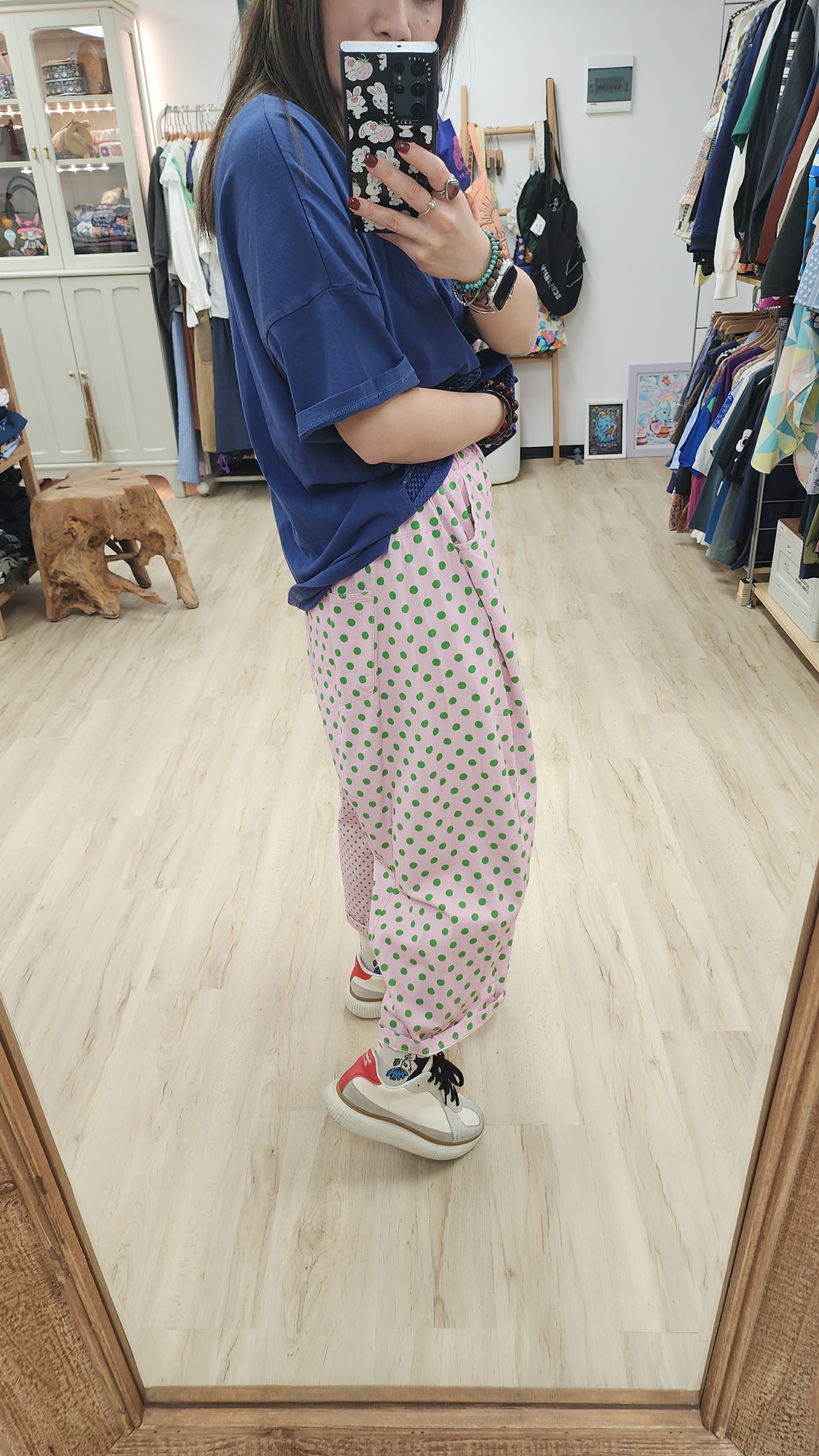 韓國粉紅拼綠鴛鴦波點斜布橡筋褲
